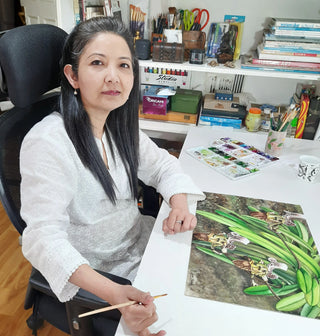 In 2002 Diki Yapshi Yuthok was in an accident in India and sustained severe spinal cord injuries that paralyzed her. While recuperating at the hospital, Diki was acquainted with the joys of painting, a means to give wings to her hidden creativity when as a part of the exercise of her 'dead' fingers, she was given a brush and a plain canvas. She started painting to exercise her fingers as she underwent physiotherapy, and it turned into an enduring passion. Diki paints the nature and Buddhist characters around her. Her paintings are in great demand in Asia, and through a unique partnership, we intend to bring more of her artworks to our Etsy shop.